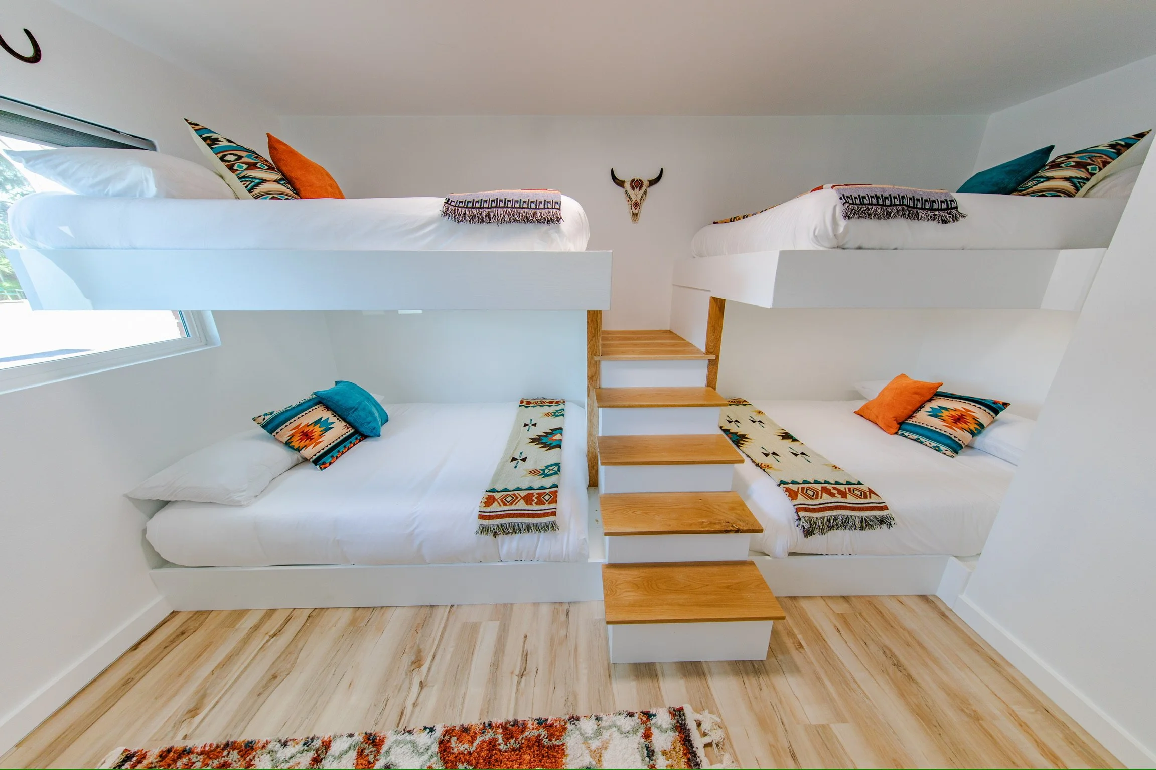 A room with four beds, two on the lower level and two above, connected by a small wooden staircase in the middle. The beds have colorful patterned pillows and blankets, and there is a decorative bull skull on the wall.