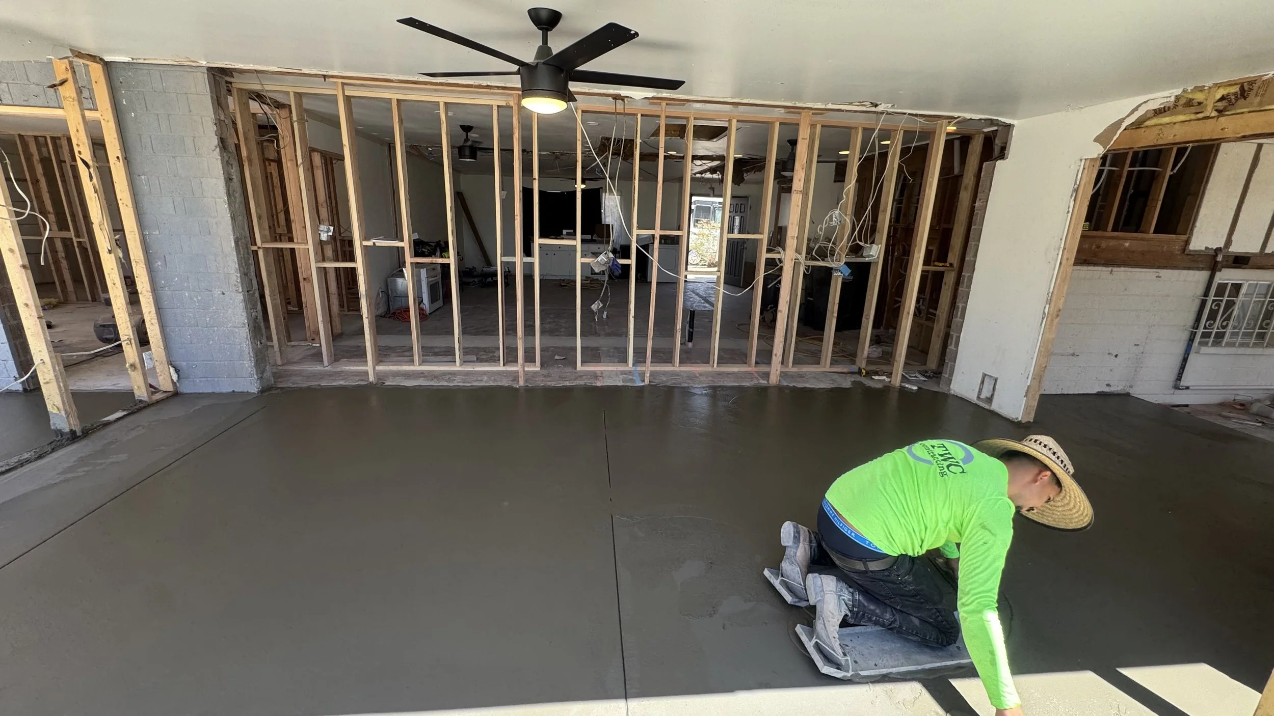 Construction worker kneeling on freshly poured concrete floor inside a house, with exposed wooden framing and ceiling fans in the background.
