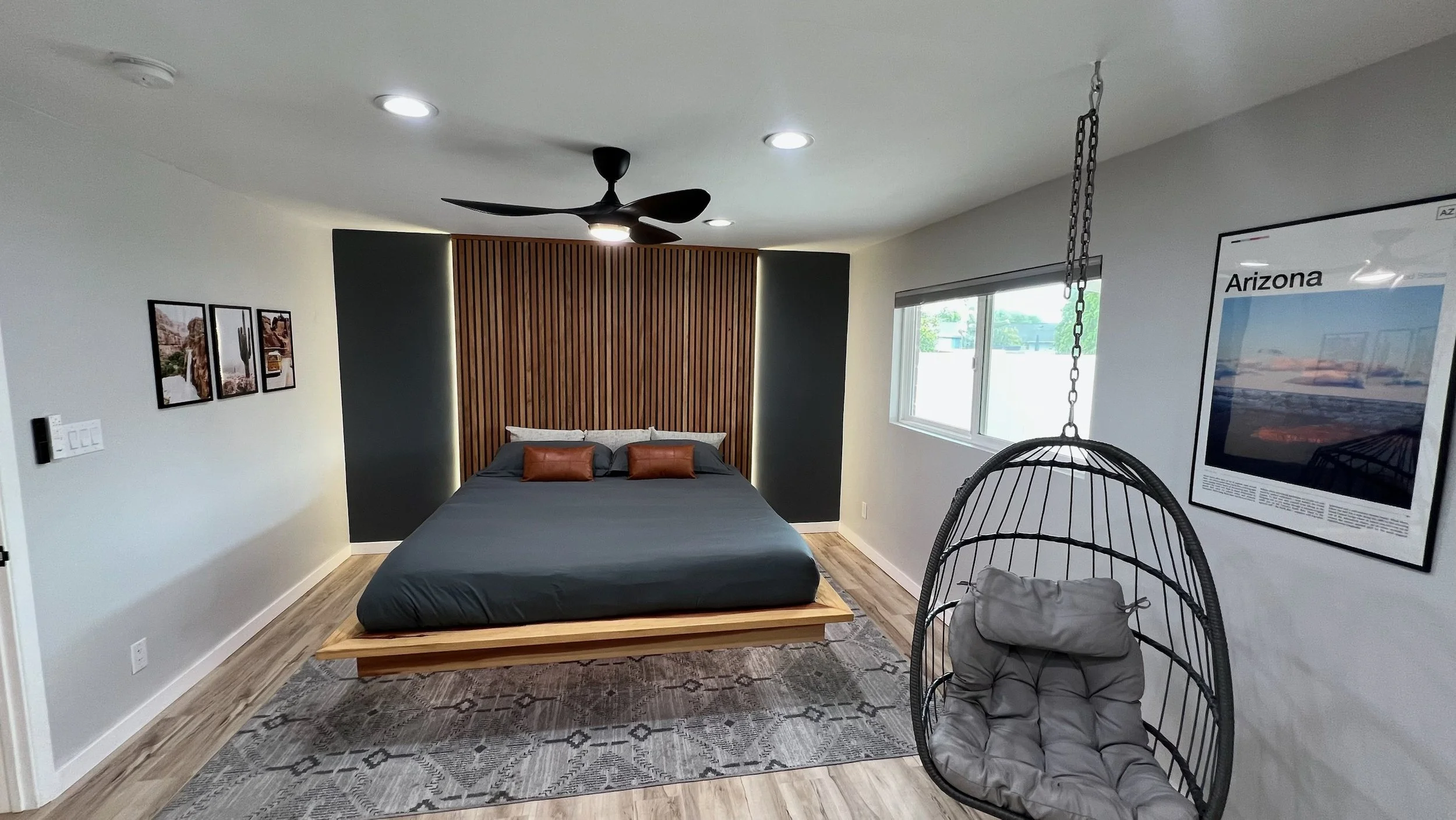 Modern bedroom with wooden accent wall, king-sized bed with gray bedding and brown pillows, hanging egg-shaped chair with cushion, framed Arizona poster, and window with natural light.